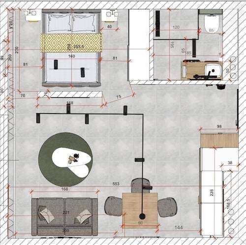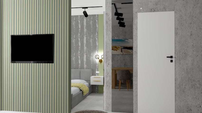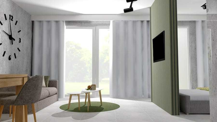 • Przestronnego pokoju z aneksem kuchennym, w którym wydzielono komfortową sypialnię,