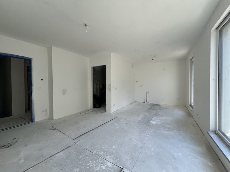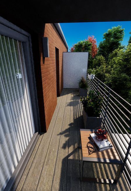 Przestronny pokój z aneksem kuchennym z wydzielonym miejscem do spania prowadzi na duży taras o powierzchni 9,75 m², rozciągający się wzdłuż całego apartamentu - idealne miejsce na poranną kawę lub relaks po pracy. Łazienka ma 3,7 m² i jest praktycznie zaprojektowana.